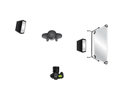 Y aquí tenemos el esquema de iluminación que utilizamos, un flash Canon EX580II rebotado en una pared blanca a la derecha, y un flash canon EX430 en la izquierda, un poco retrasado.